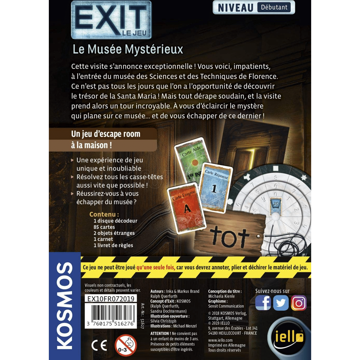 EXIT est un jeu qui reprend les sensations des "escape games". Muni d'indices, de matériel et d'un décodeur, vous aurez pour mission de sortir du jeu le plus rapidement possible.Plus qu'un jeu : une expérience unique et immersive dans laquelle vous devrez faire preuve de coopération, d'observation et de logique.Toute spécialement conçue pour les joueurs débutants, cette nouvelle boîte est idéale pour s'initier et découvrir l'incroyable expérience EXIT !Caractéristiques