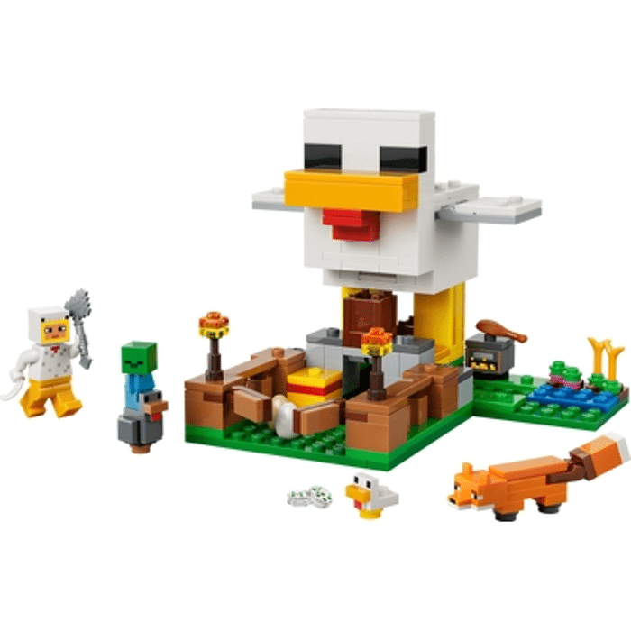 Le poulailler factice a la forme d'un poulet avec des ailes mobiles et un enclos à l'avant avec une porte qui s'ouvre. Le poulet géant pond des œufs à l'arrière et distribue des graines de sa bouche dans un récipient qui bascule vers l'avant lorsque les poulets ont besoin de nourriture. Les accessoires amusants comprennent des torches, du foin, un fumoir, 2 œufs, 2 lots de graines, une cuisse de poulet, une plume et une hache.