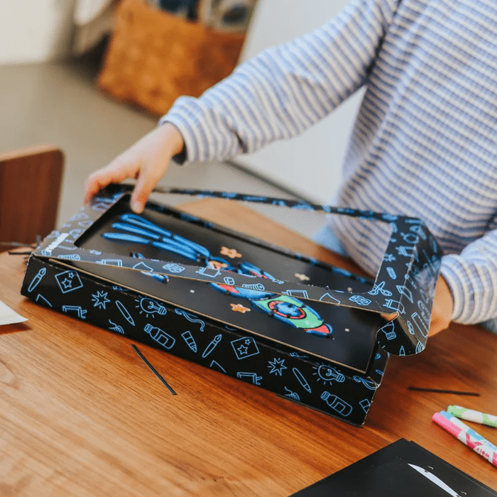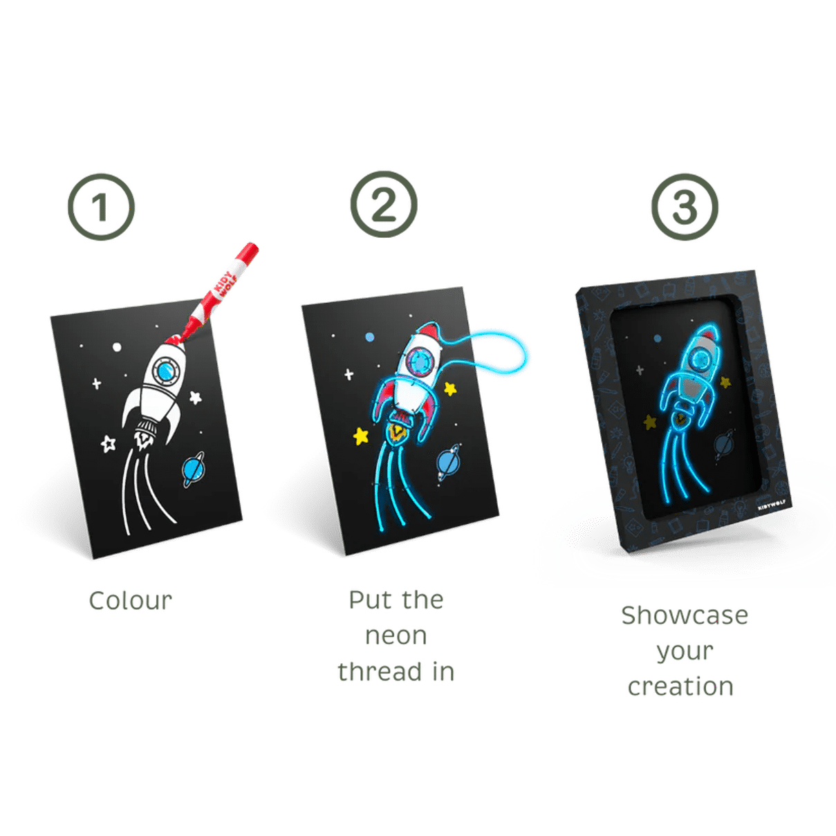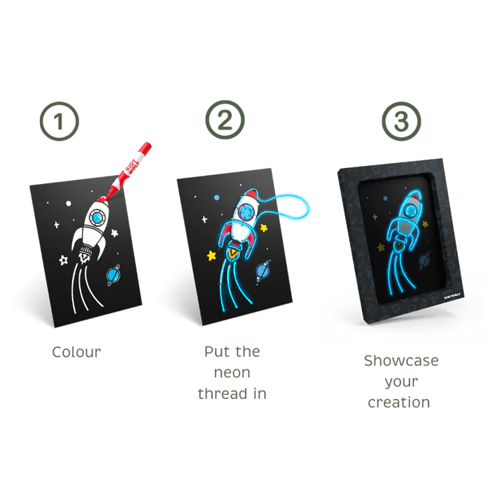 KIDYNEON révolutionne le jeu créatif grâce à une touche de magie lumineuse ! À l'aide d'un fil fluo enfilé sur une planche perforée, les enfants créent des dessins originaux et éblouissants qu'ils pourront fièrement exposer. Cette activité manuelle stimule la créativité tout en développant la motricité fine et la concentration. Sans écran, 100 % captivant !