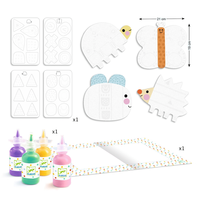 Quelques gouttes de peinture… pour colorer les animaux avec les doigts. Magique, de petits motifs apparaissent ! L’enfant place les autocollants pour rendre les animaux encore plus beaux !