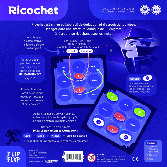 30 énigmes successives vous présentent l’aventure loufoque d’une équipe d’agents secrets. Chaque énigme est constituée d’un dialogue dont il faut découvrir la dernière phrase pour comprendre l’histoire. Pour la trouver, le ou les joueurs (en collaborant) doivent résoudre une grille de 25 mots dont la plupart doivent être cachés par des «galets». Pour les placer, les joueurs doivent trouver des couples de mots obligatoirement alignés. Chaque couple de mots amène par ricochet (association d’idées) au couple de mots suivant, jusqu’à ce que tous les galets soient posés. A la fin, les mots encore visibles (de 3 à 5) présentent un rébus drôle qui, une fois lu à haute voix dans le bon ordre, permet aux joueurs de découvrir une phrase ! La dernière du dialogue...
