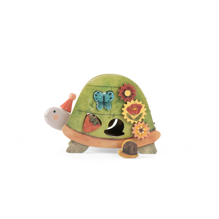 Cette adorable tortue en bois offre 4 faces riches en découvertes de jeux et d'apprentissages