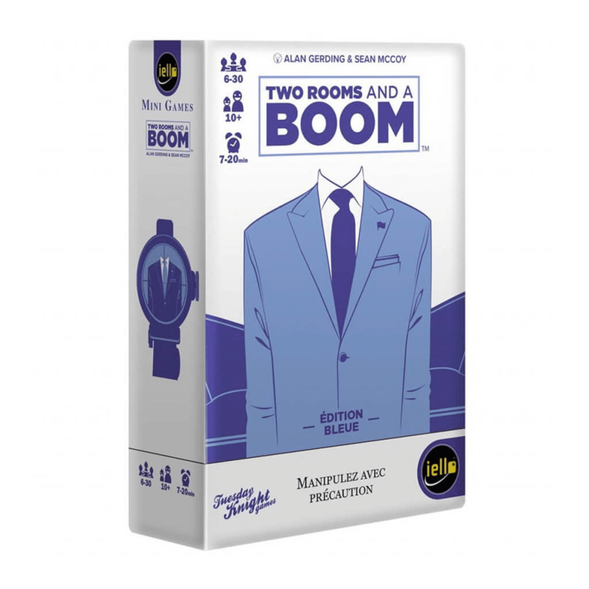 Identifiez le coupable... et sa cible !Le Président est la cible d'une attaque ! Mais qui est le Président ? Et plus important encore... Qui est le poseur de bombe ? Dans ce jeu explosif, vous êtes répartis dans deux pièces séparées. Retrouvez vos coéquipiers, bluffez, négociez, et désignez les otages qui changeront de pièce. Lors du décompte final, si le Président est dans la même pièce que le Poseur de bombe, ça fait BOUM ! Dans Two Rooms and a Boom, vous devez remplir l’objectif défini par votre carte Personnage. Cet objectif peut être commun à une équipe (bleue ou rouge), mais peut aussi être unique et personnel (verte).Au début de la partie, les joueurs sont répartis de manière égale entre deux zones de jeu distinctes (généralement deux pièces séparées), puis chaque joueur reçoit au hasard une carte Personnage face cachée. A qui allez-vous faire confiance ? La partie se déroule en plusieurs tours minutés, chaque tour étant plus court que le précédent. Vous devrez utiliser le temps imparti pour deviner le personnage des autres joueurs. Pour cela, il vous faudra partager votre couleur ou votre carte complète, car les partages sont bien souvent réciproques : plus vous en dévoilez sur vous-même, plus vous en apprenez sur les autres.À vous d’analyser le comportement de chacun : un joueur qui reste dans son coin doit avoir une bonne raison, de même qu’un joueur qui essaye de se mettre en avant. Avant la fin du premier tour, les joueurs argumentent, selon les critères de leur choix, jusqu’à définir le leader de leur pièce. Ce leader désigne alors des otages. À la fin de chaque tour, les otages désignés par le leader de chaque pièce sont échangés. La partie se termine après le dernier échange d’otages. Chaque joueur révèle alors sa carte. Si le Poseur de bombe se trouve dans la même pièce que le Président, alors l’Équipe rouge l’emporte. Sinon, l’Équipe bleue l’emporte. Un joueur ayant reçu une carte Personnage grise peut gagner ou perdre la partie indépendamment.Caractéristiques