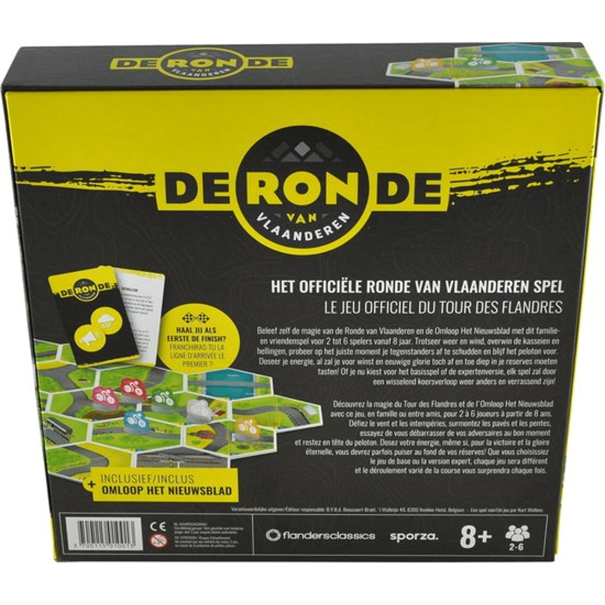 Het officiële Ronde van Vlaanderen spel.Beleef zelf de magie van de Ronde van Vlaanderen en de Omloop Het Nieuwsblad met dit familie- en vriendenspel voor 2 tot 6 spelers vanaf 8 jaar. Trotseer weer en wind, overwin de kasseien en hellingen, probeer op het juiste moment je tegenstanders af te schudden en blijf het peloton voor. Doseer je energie, al zal je voor winst en eeuwige glorie toch af en toe diep in je reserves moeten tasten! Of je nu kiest voor het basisspel of de expertenversie, elk spel zal door een wisselend koersverloop weer anders en verrassend zijn!