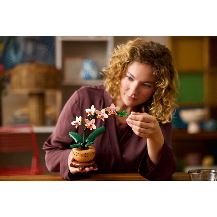 Deze realistische replica bevat 5 bloeiende orchideeën en een paar knoppen, evenals bladeren voor extra realisme. De licht terracottakleurige pot staat op een mooie voet met houtlook, waardoor beginnende bloemisten deze LEGO-bloem, die de rust van de natuur oproept, gemakkelijk in hun interieur of op hun werkplek kunnen neerzetten.